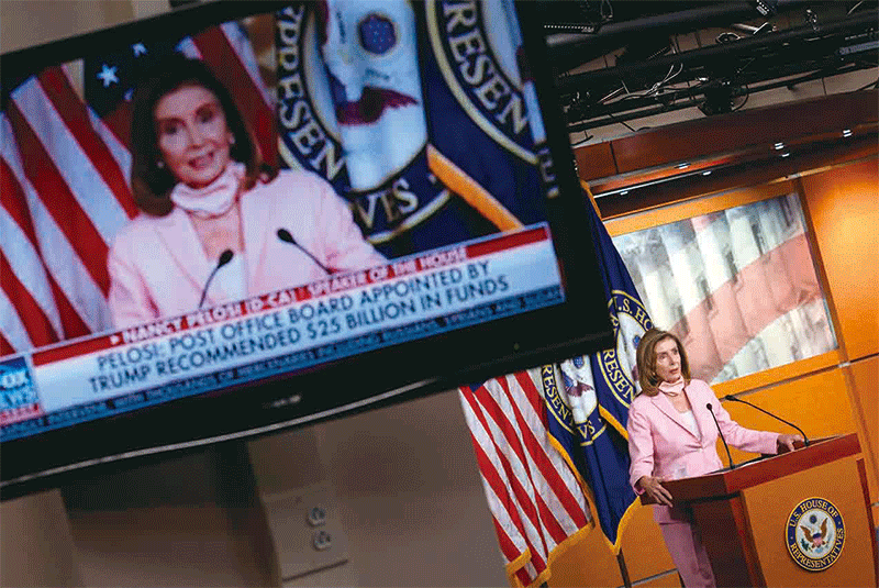 眾院議長佩洛西(圖)和民主黨各州堅持要用郵寄選票,總統特朗普認為全民郵寄選票將導致選舉舞弊。美國郵政局如今成了總統大選的爭議焦點。(AFP)