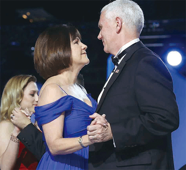 彭斯從不與妻子以外的女士單獨吃飯,沒有妻子的陪伴他也不會參加這類的飲宴。圖為他2017年與妻子在華盛頓會議中心舉行的自由舞會上跳舞。(Getty Images)