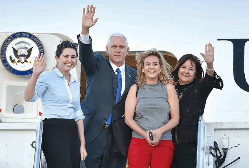 彭斯曾為了必須供養三個子女上大學,家庭經濟負擔重,而對特朗普邀請他作為副總統候選人參與競選猶豫不決。圖為他與妻子(右一)及兩個女兒。(AFP)
