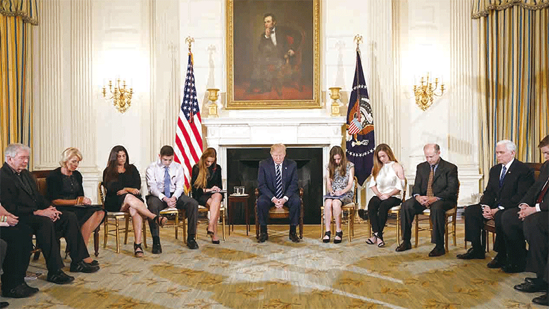 彭斯成為美國副總統後,依然堅持參加主日敬拜,每周出席白宮內閣查經班。圖為特朗普(中)與彭斯(右二)等人在白宮內祈禱。(AFP)