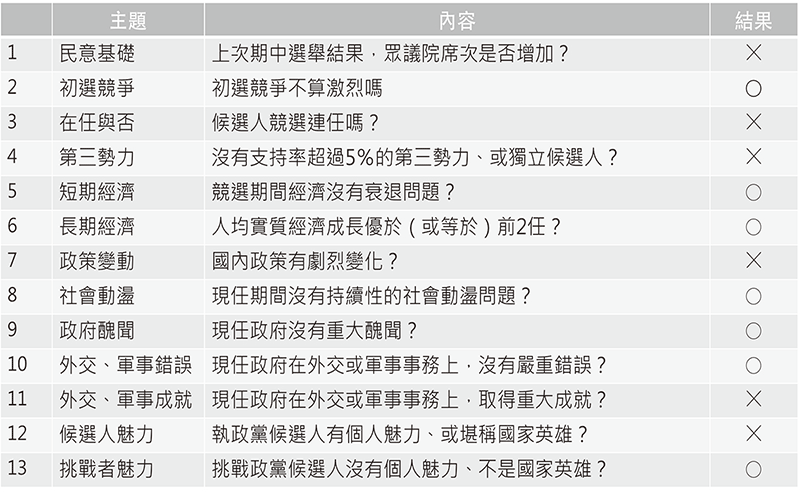 他分析1860年到1980年間的總統大選,歸納出影響「執政黨」續任與否的13個關鍵是非題(見下表),得分越高、施政成績越好,「錯」6題以上就會選輸。