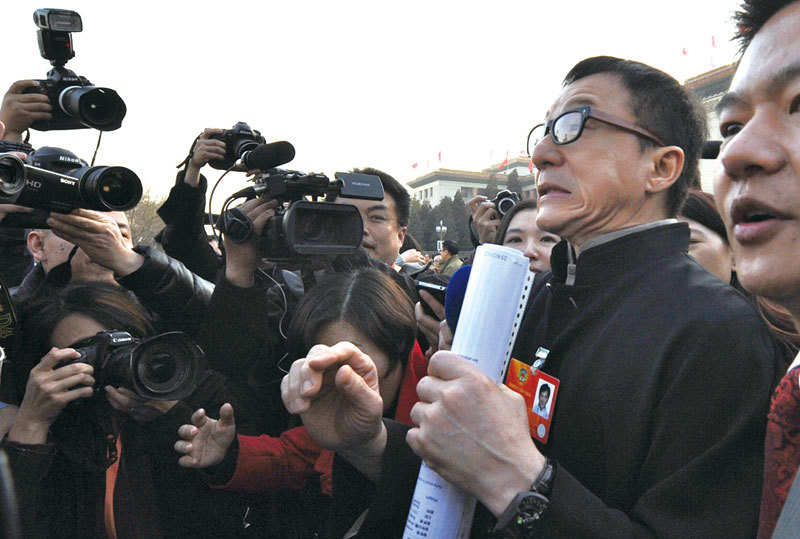 2014年成龍兒子房祖名吸毒被抓,據稱成龍當時向習近平求救遭拒。圖為2013年成龍參加中共兩會。(AFP)
