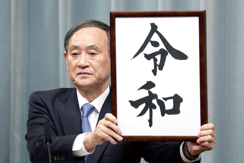 2019年4月日本從平成年代進入令和年代時,菅義偉高舉「令和」年號字板,被稱為「令和大叔」。(Getty Images)