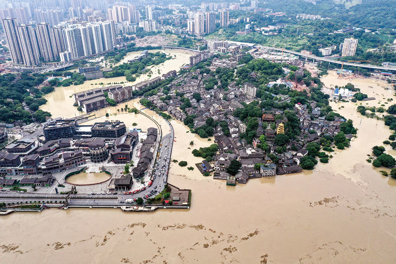 分析指,長江三峽水災嚴重,三峽大壩周邊有三個核電廠,一旦潰壩,核輻射將污染整個亞洲。圖為8月19日重慶水災地區的航拍照片。(AFP)
