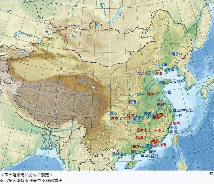 外國專家警告,中共核電站都建立在海邊,不僅有海嘯洪水潛在危險,也受到地震威脅。圖為中國大陸核電站分布圖。(維基百科網站截圖)
