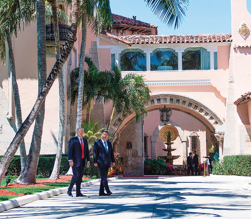 特朗普2017 年與習近平國宴時,突然離席下令空襲敘利亞。俞懷松說,習對此侮辱沒有任何反應,未通過特朗普對他的試驗。圖為兩人在海湖莊園散步。(AFP)