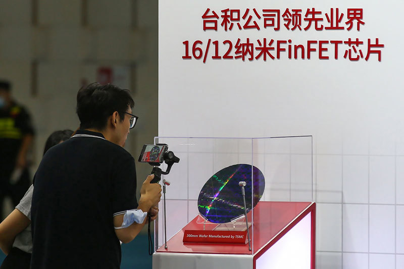 大陸晶片廠商的市場份額不足5%,而全球居首的台積電則占有54%的市場份額。圖為2020年8月26日南京2020年世界半導體大會上的台積電(TSMC)晶片。(AFP)