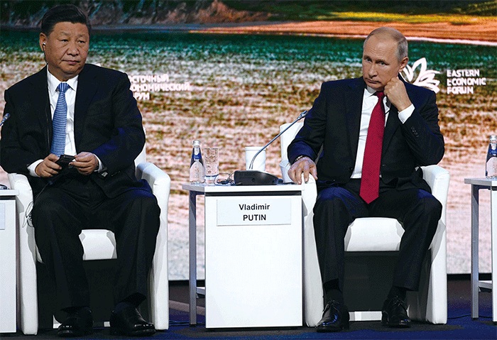 俄羅斯的疫情從3月下旬急轉直下,這恰好與普京和中共領導人習近平三次通電話讚美中共的軌跡重合。圖為兩人2018年9月參加東部經濟論壇會議。(Getty Images)