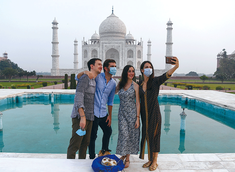 在疫情危機逼近之際,印度仍繼續採取刺激經濟的「開放」手段。圖為2020年9月21日,遊客在泰姬陵拍照。(AFP)