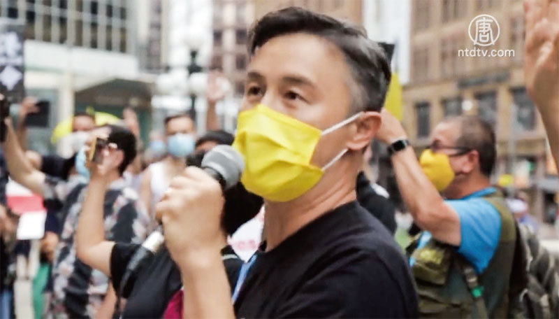 回到加拿大定居,鄭敬基積極參加當地舉辦的支持香港民主的活動。圖為2020 年8 月16 日鄭敬基在多倫多撐港集會上領唱《榮光》。(新唐人)