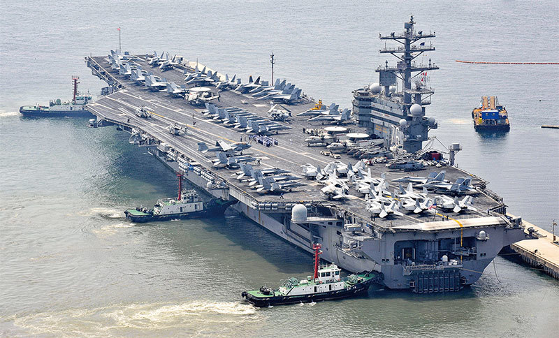 特朗普政府對北京在南海爭搶地盤採取強硬立場。美國海軍近期宣布雷根號航空母艦打擊群(包括航母本身、戰鬥機聯隊、驅逐艦等)正部署南海。(AFP)