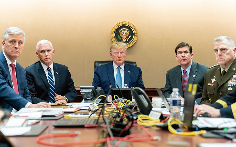 伊斯蘭國首腦巴格達迪於2019 年10 月26 日在美軍夜襲行動中被殲滅。圖為特朗普(中)與副總統彭斯(左二)等人當天在白宮戰情室監視殲滅行動。(Getty Images)