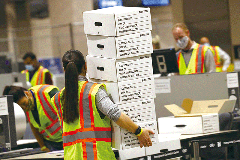這次美國大選出現30萬張郵遞票「丟失」。圖為2020年11月4日,賓州費城的選舉工作人員正在進行計票流程。(Spencer Platt/Getty Images)