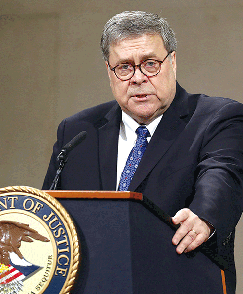 美國司法部長威廉.巴爾11月9日發出備忘錄,授權聯邦檢查官對大量的投票違規指控進行調查。圖為2019年5月9日資料照。(Chip Somodevilla/Getty Images)