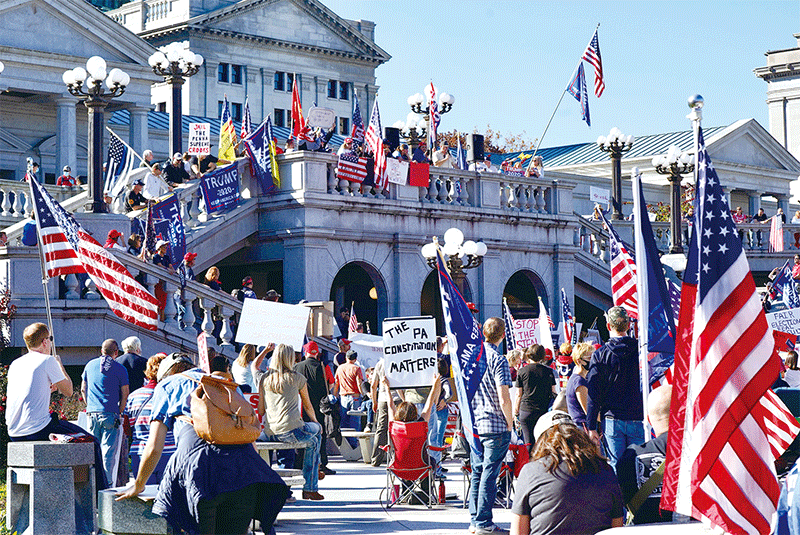 11月7日,賓州議會大樓前的抗議者反對選舉舞弊。(李臻婷/大紀元)