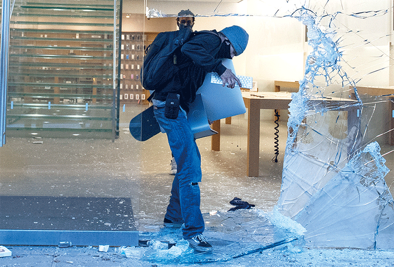 「安提法」和「黑命貴」在多個民主黨控制的城市打砸搶,特朗普敦促打擊,但埃斯珀抵制援引《叛亂法》派軍隊處理。圖為一男子搶掠洛杉磯一蘋果商店內的iMac。(Valerie Macon/AFP)