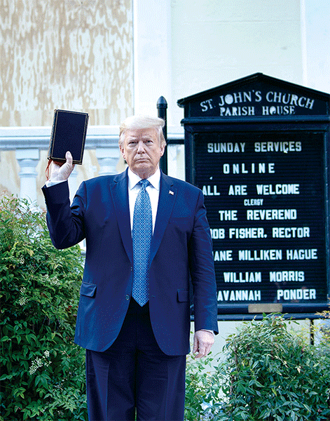 特朗普6月1日帶領眾官員走到白宮附近的聖約翰教堂,手持一本《聖經》誓言維護法律和秩序。埃斯珀最初說他不知道會和特朗普一起去教堂,但後來改口說他知道。(Brendan Smialowski/AFP)