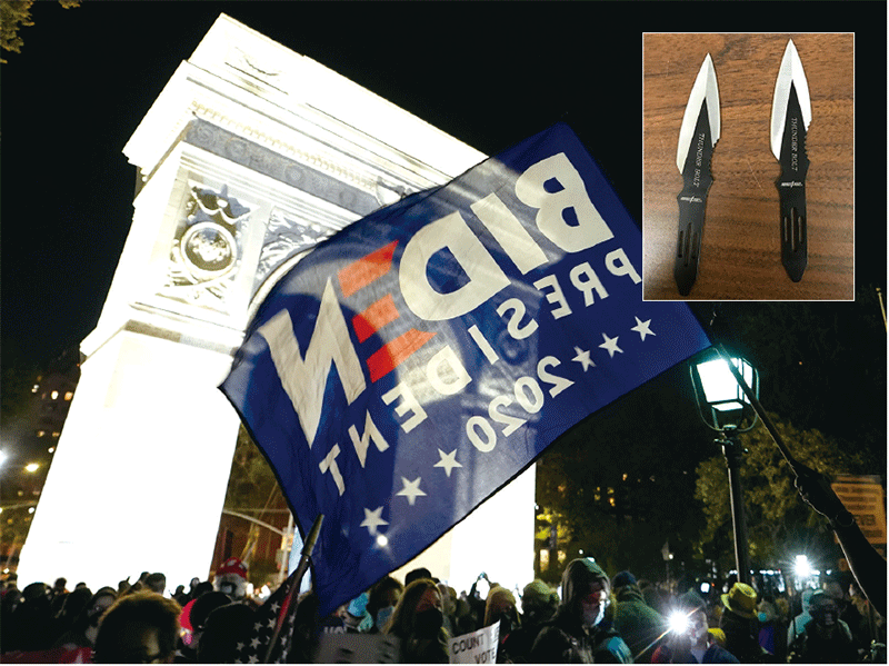 隨著特朗普展開法律戰,有大量選舉舞弊行為被曝光出來後,安提法等組織開始騷亂。在特朗普競選團隊向密歇根州及賓州發起停止計票的訴訟之際,11月4日,紐約市有一千多名支持拜登的民眾走上街頭抗議,要求「計算每一張選票」。晚間,部分抗議者在曼哈頓西村與警察發生衝突,他們燃燒街道旁的垃圾,大喊「將警局夷為平地」等口號。警方逮捕了57名暴力抗議者,還在這些抗議者身上搜出尖刀、電擊槍等致命武器。警方在推特表示,「這些不是和平抗議的工具」。