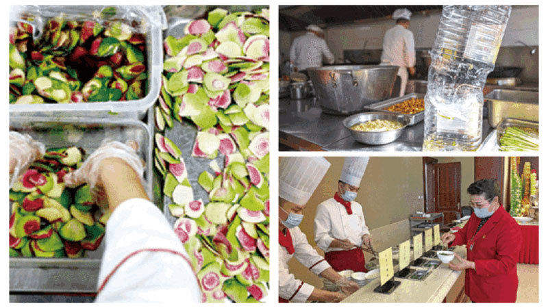 在廚房的牆上貼著「分檔取料、物盡其用」八個大字,據廚師介紹:「白菜可以三吃,白菜葉做湯爆白菜頭,白菜幫子做醋溜白菜,白菜根做鹹菜;還有蘿蔔皮、芹菜根,都能用來做鹹菜,既節約又可口,大家十分歡迎。」