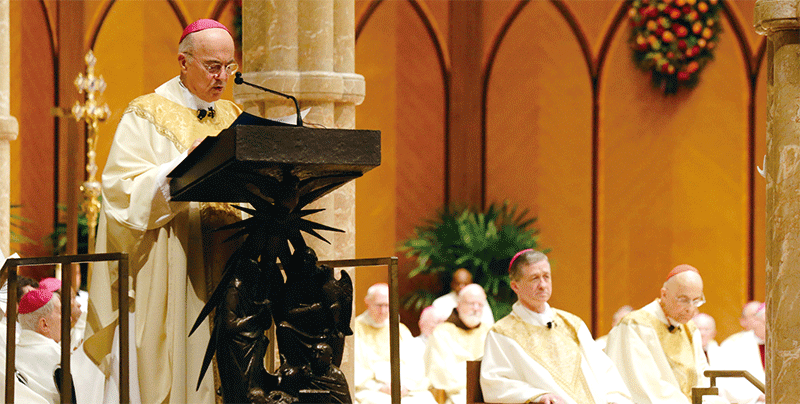 天主教前任駐美國大主教維加諾建議特朗普總統,「祈求萬王之王救贖你的國度」。圖為2014年11月18日維加諾大主教在芝加哥聖名大教堂宣讀使徒授權。(Charles Rex Arbogast-Pool/Getty Images)