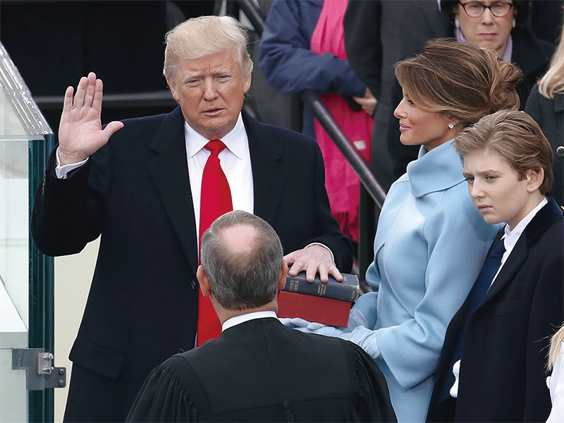 神告訴泰勒,神的敵人會花費數十億美元想保住他們想要的總統,但神會保護特朗普,他將會順利連任。圖為2017年1月20日,特朗普在首席大法官的支持下宣誓就職。(Drew Angerer/Getty Images)