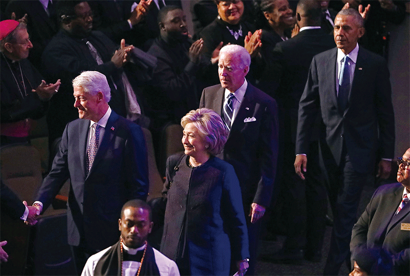 解密文件證實,希拉里2016年7月26日批准「通俄門」抹黑特朗普,此計畫經奧巴馬許可或參與。圖為2019年10月25日,前總統克林頓希拉里夫婦、前副總統拜登和前總統奧巴馬參加一葬禮。(Chip Somodevilla/Getty Images)