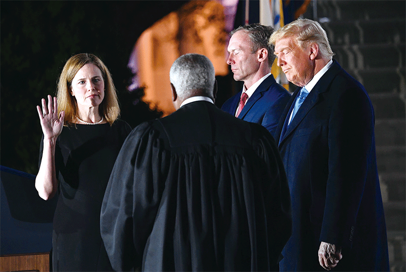 10月26日,特朗普總統提名的保守派大法官巴瑞特(Amy Coney Barrett)在白宮宣誓就職。(Nicholas Kamm/AFP)