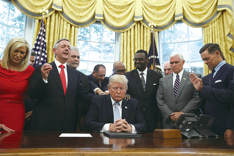 2020美國大選中舞弊亂象,面對黑暗勢力展開的凶猛狙擊,特朗普總統與左派勢力和中共紅魔進行激戰。圖為「國家祈禱日 」特朗普和官員在白宮祈禱。(Alex Wong/Getty Images)