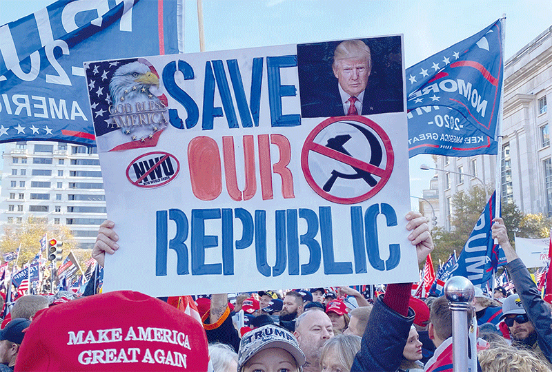 11月14日,來自美國各州50萬民眾在美國首都華盛頓DC舉行挺特朗普大遊行,民眾拿著禁止共產黨及「救救和眾國」標語。(施萍/大紀元)