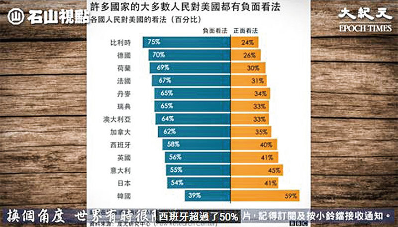 反對派攻擊特朗普得罪大量友邦。其實美國在北約的角色有如自己掏腰包的保鑣,現在要求歐洲國家增加對北約的投入,歐洲人不高興是可以理解的。圖為13 個美國傳統盟友對美國觀感的比例。(視頻截圖)