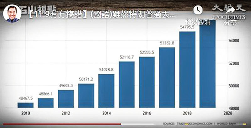 美國的人均GDP,2016 年是5.2 萬多美元,2019 年是接近5.6 萬,2016 年之後明顯在加速。(視頻截圖)