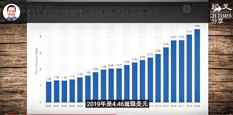 外國對美國的直接投資,2019 年是4.46 萬億美元,增長相當可觀,這和特朗普的經濟政策有關,外國商家為了進入美國市場,就要在美國設廠。(視頻截圖)