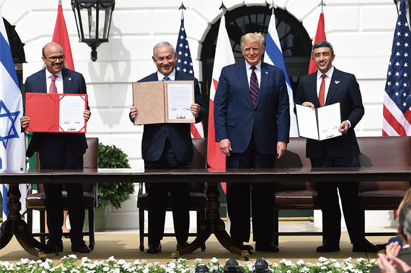 美國大使館搬到耶路撒冷,不但沒有爆發新危機,反而促成了以、阿外交上的突破,阿聯酋(右一)、巴林( 左一)、以色列( 左二)三國簽署關係正常化協議。(Saul Loeb/AFP)