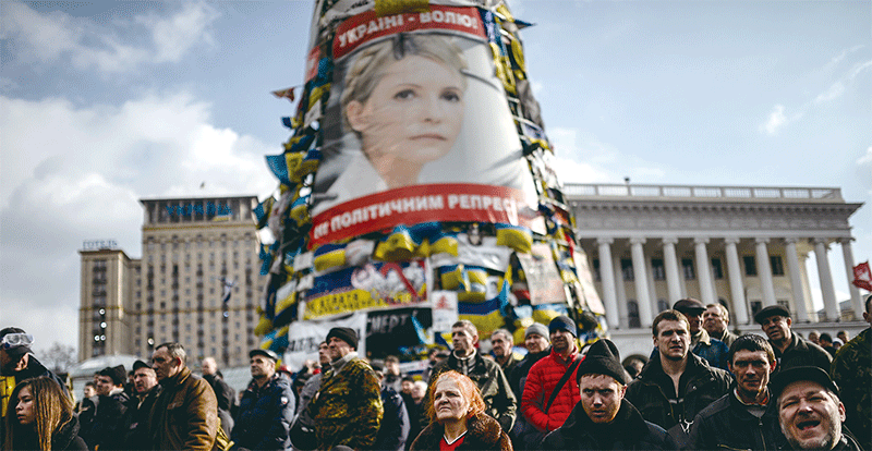 2014年2月22日烏克蘭前總理、反對派領導人季莫申科被當局從監獄釋放。圖為21日基輔獨立廣場反對派人士製作的大型季莫申科展板。(BULENT KILIC/AFP)