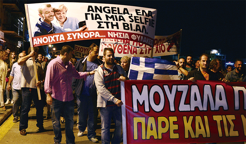 德國的穆斯林人口占總人口的10%,大約800萬,這是政治家不敢忽視的選票來源。圖為2016年9月28日,希臘希俄斯島民眾組織反難民遊行,抗議默克爾的難民政策。(Louisa Gouliamaki /AFP)