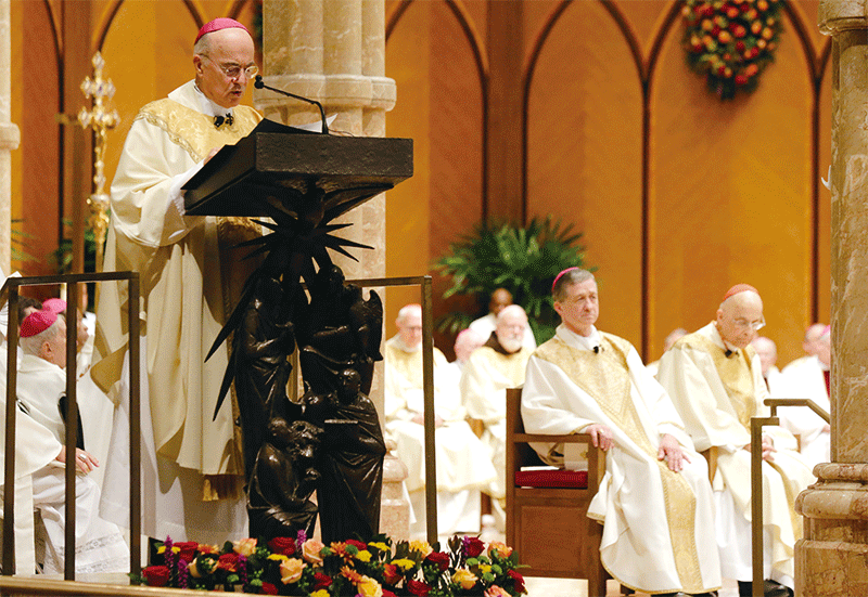 前梵蒂岡駐美特使維加諾大主教在給特朗普總統的公開信中指出,比爾.蓋茨在全球精英團伙的「大重構」計畫中扮演重要角色。圖為維加諾大主教2014年11月18日資料照。(Charles Rex Arbogast/Getty Images)