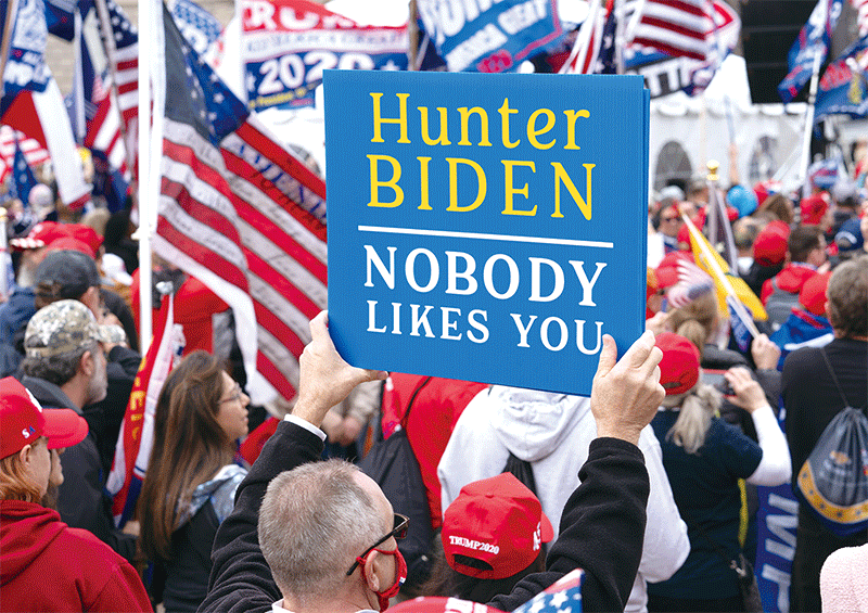 2020年10月14、15日,《紐約郵報》曝光亨特.拜登與烏克蘭和中共勾兌的一些證據,證實拜登亦捲入此腐敗醜聞。圖為12月12日,民眾在支持特朗普的遊行集會中高舉「亨特.拜登 沒人喜歡你」的展板。(Leo Shi/大紀元)