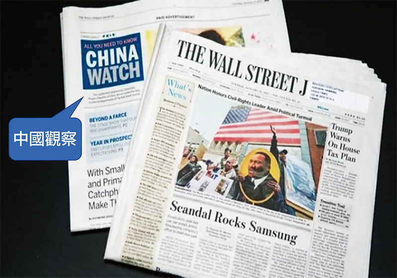 何良懋說,中共購買美國報紙版面,「放一些英文的文宣,唱好中國的故事,跨版的故事。」圖為《華爾街日報》廣告夾刊《中國觀察》(China Watch)實為中共大外宣。(Benjamin Chasteen / The Epoch Times)