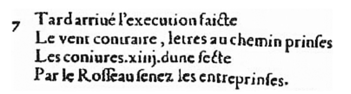 出版商Macé Bonhomme於1555年印刷的最早版本的《諸世紀》第一紀第7首詩。(公有領域)