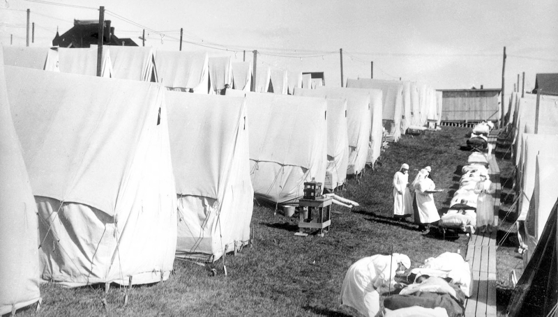 1918年西班牙流感第二波蔓延到世界各地,變異的病毒出現劇毒,患者在幾小時或幾天內死亡。白天出殯聲不絕於耳,晚上救護車呼嘯而過,末日景象在人們面前展開。圖為1918年在西班牙一處戶外護理患者處。(Hulton Archive/Getty Images)
