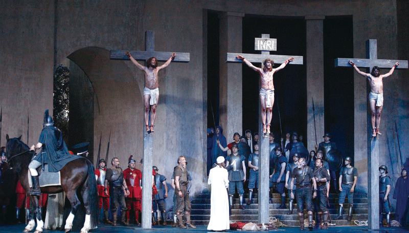 在17世紀,黑死病橫掃歐洲之際,德國歐伯阿瑪高小鎮向上帝祈禱並發誓,神奇地遠離了疫災的奇蹟。小鎮每十年上演一次《耶穌受難劇》,以感恩上帝的庇護。圖為2010年5月10日歐伯阿瑪高的耶穌受難劇。(Sebastian Widmann / AFP)