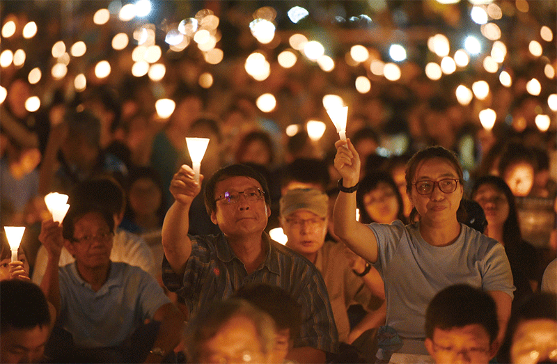 2020年6月4日,港人堅持了30年的「六四燭光晚會」首次被禁。當日傍晚約6時半,仍有大量市民在維園一同點燃燭光,參與六四集會。(文瀚林/大紀元)