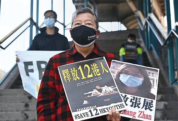 在流亡臺灣途中被大陸海警截獲的12名香港抗爭者,被送中扣押在深圳,回港無期。圖為2020年12月28日,港支聯會主席李卓人前往中聯辦,籲釋放12港人。(宋碧龍/大紀元)