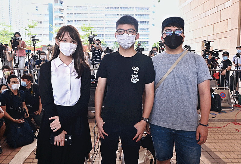 前香港眾志成員黃之鋒(中)、周庭(左)、林朗彥(右),2020年8月5日在西九龍裁判法院出庭聆訊。(宋碧龍/大紀元)