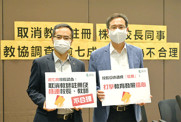 香港教育局10月公布以「嚴重專業失德」為由取消九龍塘宣道小學一名教師的註冊,七成受訪校長認為取消涉事教師的註冊並不合理。圖為教協會長馮偉華(左)、副會長葉建源(右)。(郭威利/大紀元)