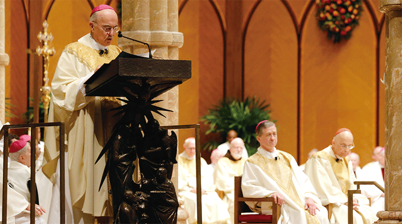天主教駐美前任大主教維加諾曾三度致函特朗普,揭露美國正在進行邪惡勢力和光明之子的正邪大戰,一些世界領導人和一幫不道德者正在採取行動征服人類。(Charles Rex Arbogast-Pool/Getty Images)