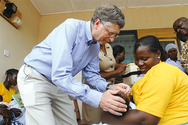 大重構要推動健康獨裁,其背後有微軟聯合創始人之一蓋茨與主要製藥集團合作推動的疫苗接種計畫。圖為蓋茨為迦納兒童提供用於腹瀉的輪狀病毒疫苗。(Pius Utomi Ekpei/AFP)