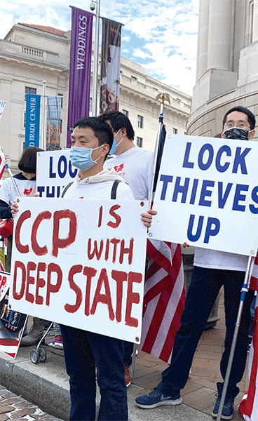 大重構的首階段是竊取美國大選。圖為抗議者2020年12月12日在華府舉行的制止竊選大型活動中手持「CCP is with DEEP STATE」(中共勾結深層政府)的展板。(Ximing Xiong/大紀元)