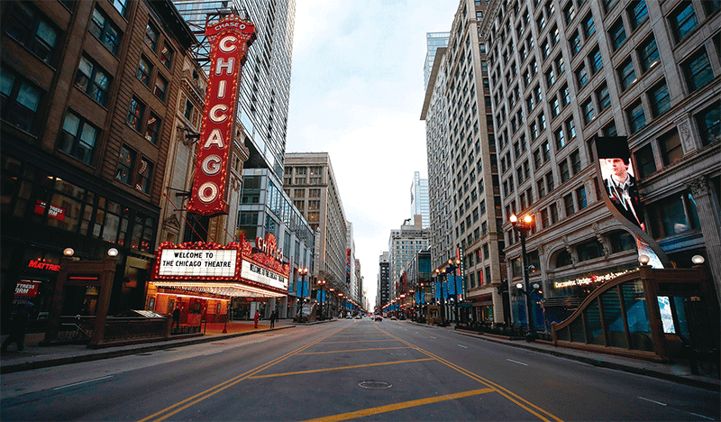 大重構的計畫之一是藉疫情強制將人們關在家裡,扼殺民眾的自由,美國很多民主黨控制的州或城市已出現這樣的情況。圖為芝加哥去年3月封城。(Kamil Krzaczynski / AFP)