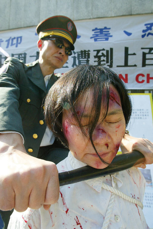 中共將維族人囚禁在集中營,虐待基督徒和法輪功學員,強摘政治犯器官,2020年又踐踏了香港的自由和自治的權利。圖為中共迫害法輪功學員示意圖。(MikeClarke /AFP)